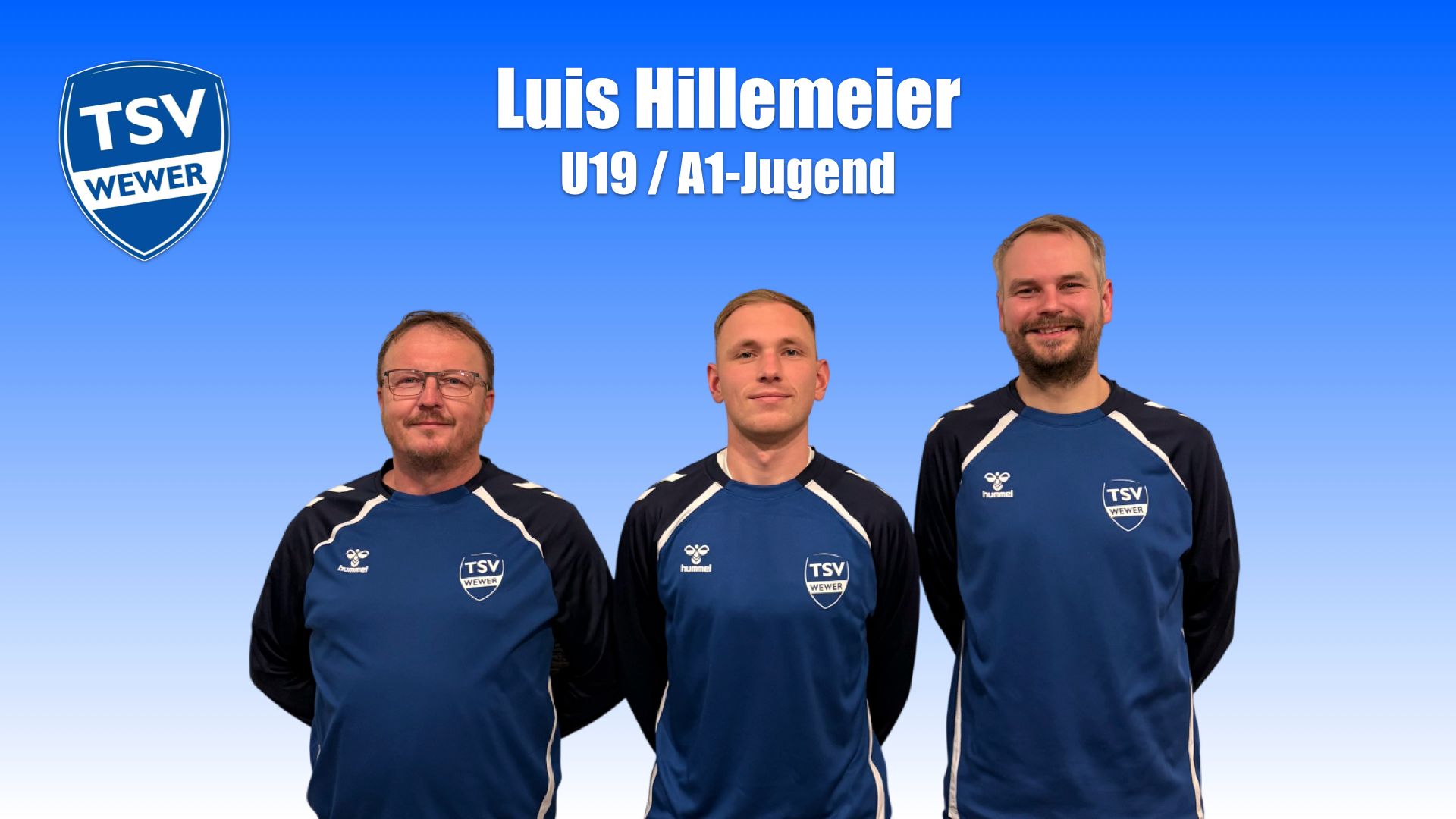 In der U19 beabsichtigt Luis Hillemeier weiterhin als Chef-Trainer tätig zu sein. Der B-Lizenzinhaber geht damit in seine sechste Saison beim TSV Wewer. Nach dem Aufstieg in die B-Jugend-Bezirksliga in der Saison 2023/24 gelang es ihm, die Liga ein Jahr später erfolgreich zu halten. Aktuell ist er mit der U19 in der Kreisliga aktiv, verfolgt mit seiner Mannschaft auch dort wieder das Ziel den Aufstieg in die Bezirksliga zu realisieren.